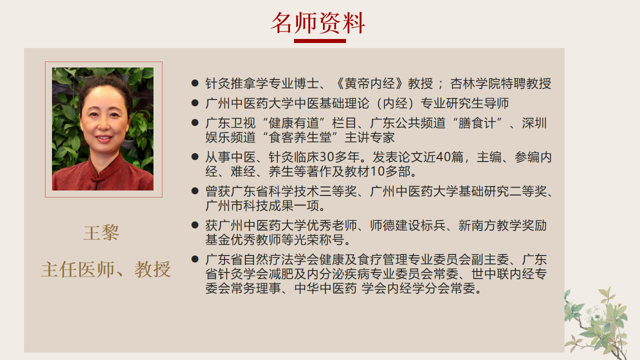 广州中医药大学中医基础理论(内经)专业研究生导师,广东卫视“健康有道”栏目、广东公共频道“膳食计”、深圳娱乐频道“食客养生堂”主讲专家。从事中医、针灸临床30多年。发表论文近40篇,主编、参编内经、难经、养生等著作及教材10多部。主持、参与国家级与省部、厅局级课题10多项。曾获广东省科学技术三等奖、广州中医药大学基础研究二等奖、广州市科技成果一项。获广州中医药大学优秀老师、师德建设标兵、新南方教学奖励基金优秀教师等光荣称号。广东省自然疗法学会健康及食疗管理专业委员会副主委、广东省针灸学会减肥及内分泌疾病专业委员会常委、世中联内经专委会常务理事、中华中医药学会内经学分会常委。